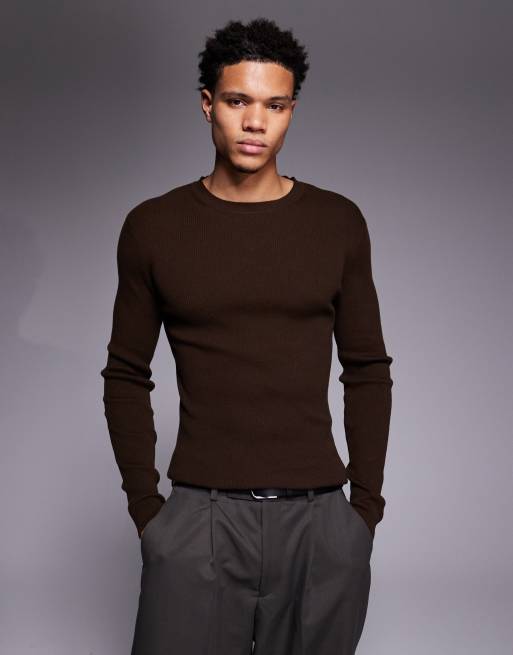 ASOS DESIGN - Maglietta attillata a maniche lunghe in misto cotone marrone a costine