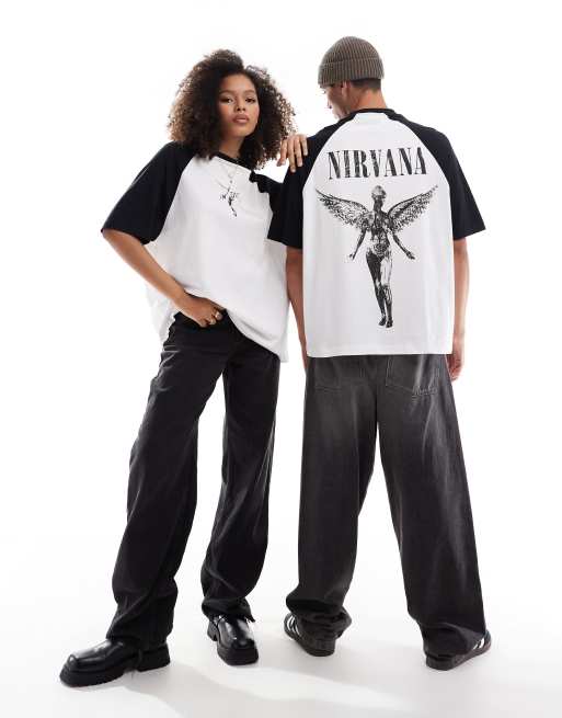 ASOS DESIGN - Maglietta unisex oversize bianca con stampa Nirvana su licenza e maniche raglan