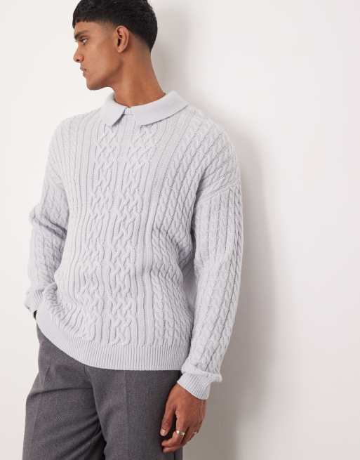 ASOS DESIGN - Maglione comodo blu lavorato a trecce con colletto stile polo