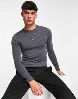 ASOS DESIGN - Maglione girocollo attillato in lana merino color antracite