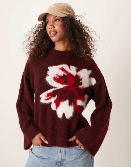 ASOS DESIGN - Maglione in maglia spazzolata bordeaux con fiore