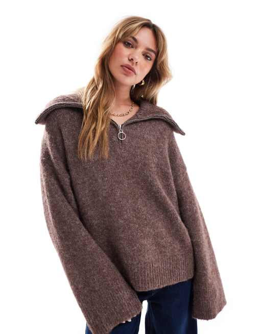 ASOS DESIGN - Maglione marrone in filato soffice con zip sul collo