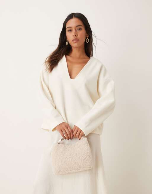 ASOS DESIGN - Maglione morbidissimo minimal bianco con scollo a V profondo