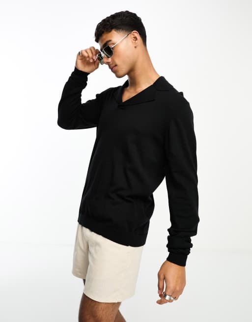 ASOS DESIGN - Maglione nero in cotone con colletto stile polo e rever