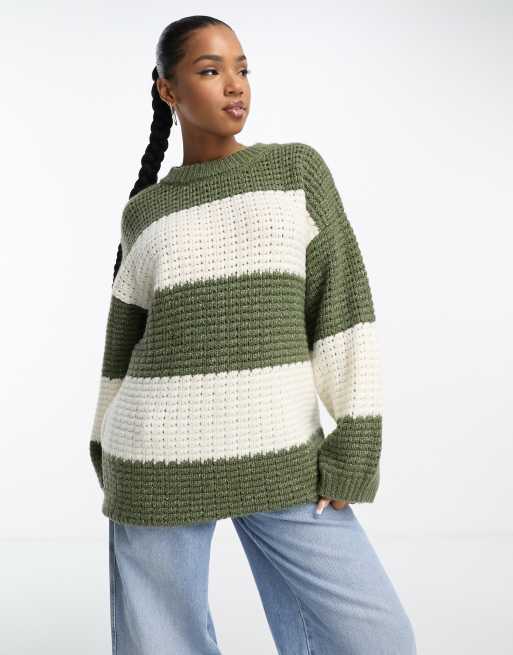 ASOS DESIGN - Maglione oversize kaki e crema a righe con impunture testurizzate