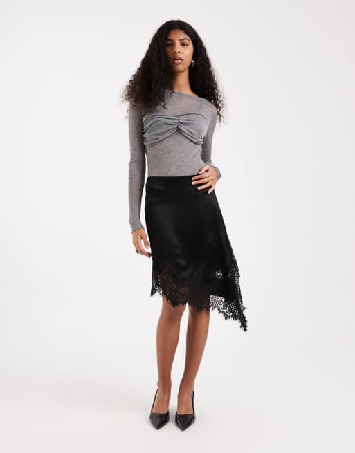ASOS DESIGN - Minigonna nera asimmetrica in raso con finiture in pizzo