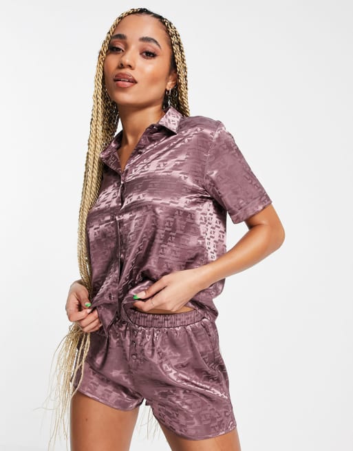 ASOS DESIGN - Mix & Match - Completo pigiama in raso color visone con monogramma AA