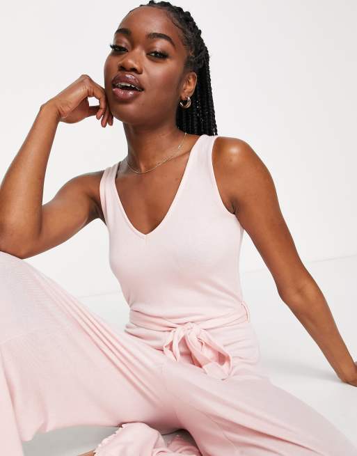 ASOS DESIGN - Mix & Match - Tuta jumpsuit da casa super morbida con laccetti in vita e fondo smerlato rosa