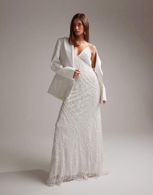 ASOS DESIGN - Neve - Vestito da sposa con spalline sottili decorato con ricami e perline