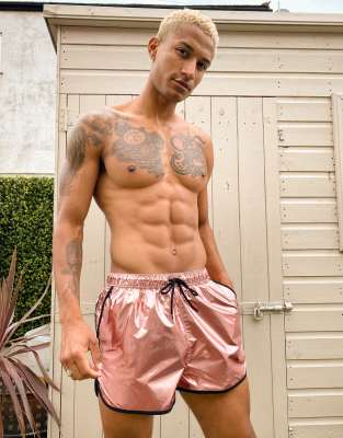 ASOS DESIGN - Pantaloncini da bagno e da corsa oro rosa metallico con profili a contrasto