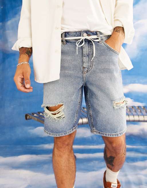 ASOS DESIGN - Pantaloncini di jeans slim lavaggio blu medio tinto con strappi profondi