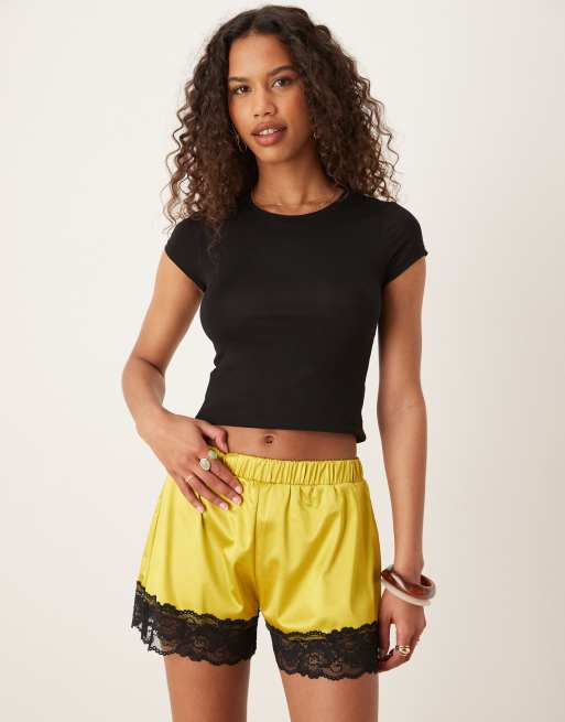 ASOS DESIGN - Pantaloncini vestibilità comoda in raso elasticizzato color lime con finiture in pizzo nero