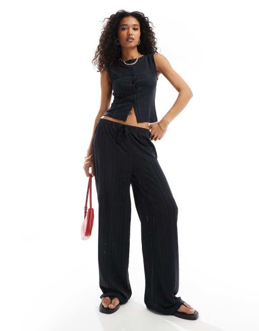 ASOS DESIGN - Pantaloni a fondo ampio e vita bassa neri in pizzo sangallo in coordinato