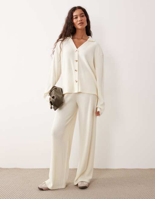 ASOS DESIGN - Pantaloni a fondo ampio morbidissimi spazzolati bianco inverno a coste in coordinato