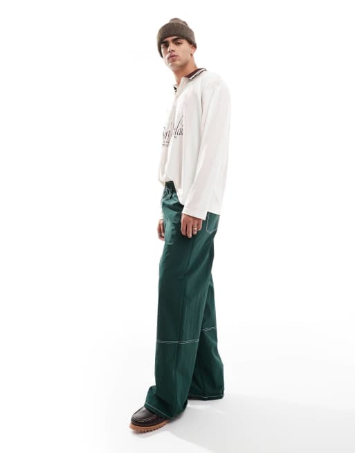 ASOS DESIGN - Pantaloni ampi verdi in nylon con cuciture a contrasto
