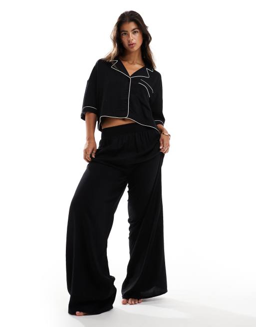 ASOS DESIGN - Pantaloni del pigiama sinuosi morbidissimi a fondo ampio neri con profili a contrasto
