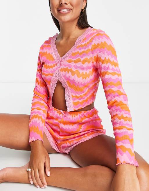 ASOS DESIGN - Pigiama rosa e arancione a onde con top a maniche lunghe e pantaloncini