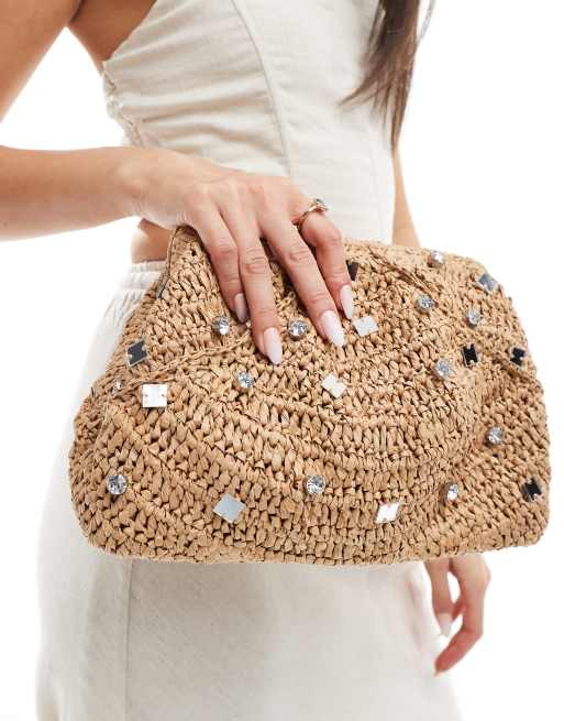 ASOS DESIGN - Pochette in paglia neutra con strass