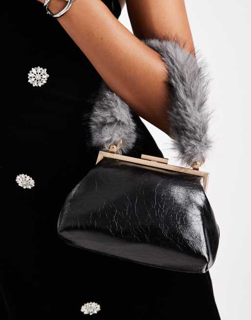 ASOS DESIGN - Pochette piccola nera con finitura testurizzata e manico superiore in pelliccia