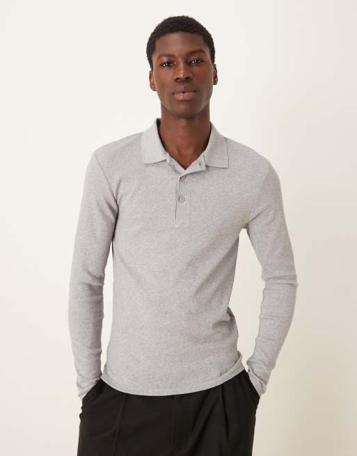 ASOS DESIGN - Polo a maniche lunghe pesante attillata a coste grigio mélange