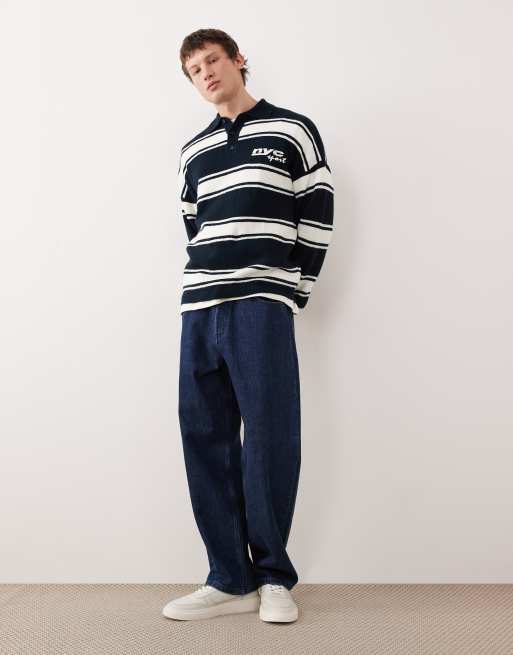 ASOS DESIGN - Polo comoda a maniche lunghe in maglia blu navy ed écru a righe con ricamo sul petto