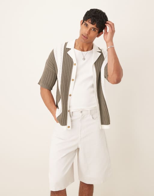 ASOS DESIGN - Polo comoda in maglia all'uncinetto verde salvia ed écru con rever e bottoni