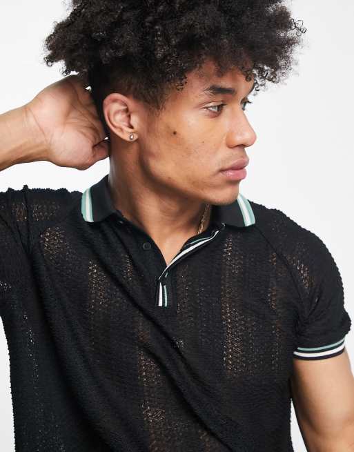 ASOS DESIGN - Polo comoda nera in pizzo con profili a contrasto