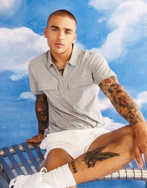 ASOS DESIGN - Polo grigio mélange con zip e tasche