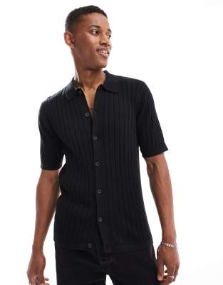 ASOS DESIGN - Polo in maglia leggera nera a coste con bottoni