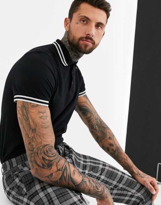 ASOS DESIGN - Polo in piqué nera con bordi a contrasto