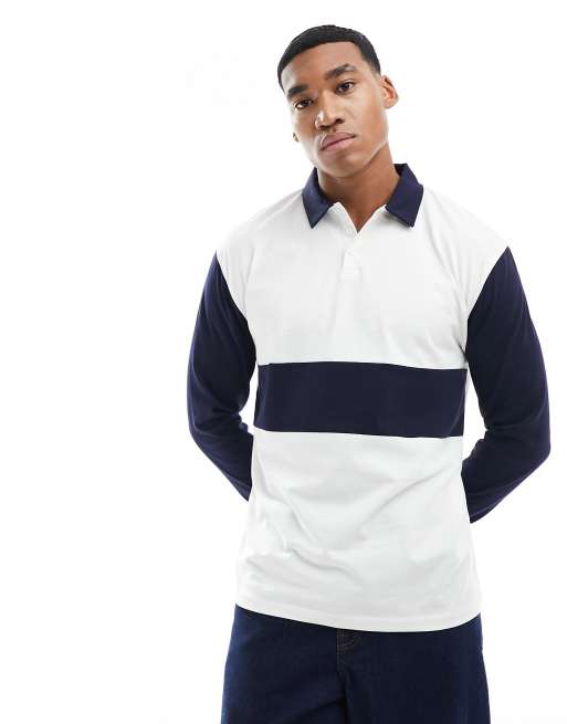 ASOS DESIGN - Polo oversize a maniche lunghe stile rugby bianca e blu con design cut & sew