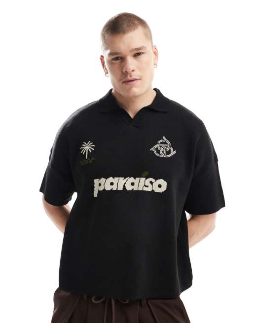 ASOS DESIGN - Polo oversize squadrata in maglia nera con stampa "Paraiso" sul petto