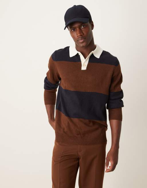 ASOS DESIGN - Polo stile rugby in maglia a righe marrone e blu navy a coste