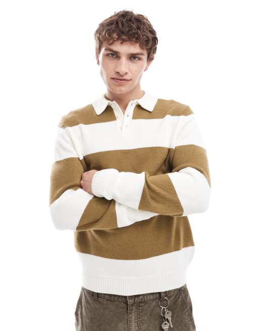 ASOS DESIGN - Polo stile rugby in maglia écru e kaki a righe