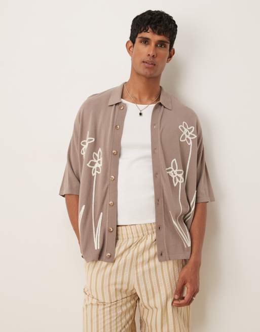 ASOS DESIGN - Polo vestibilità comoda in maglia marrone con motivo a fiori e bottoni