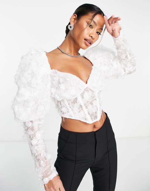ASOS DESIGN - Premium 3D - Top a corsetto in pizzo bianco con maniche a sbuffo