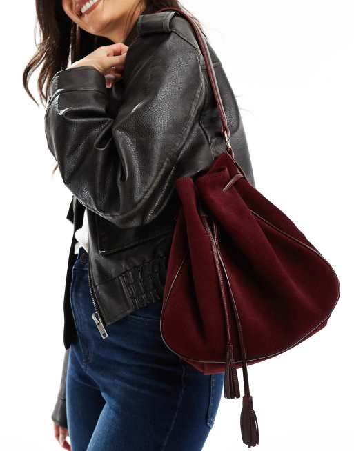 ASOS DESIGN - Premium - Borsa da spalla a secchiello in camoscio bordeaux con nappa