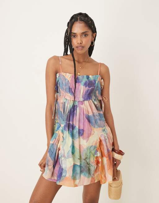 ASOS DESIGN - Prendisole babydoll corto con stampa sfocata a fiori e fondo con volant