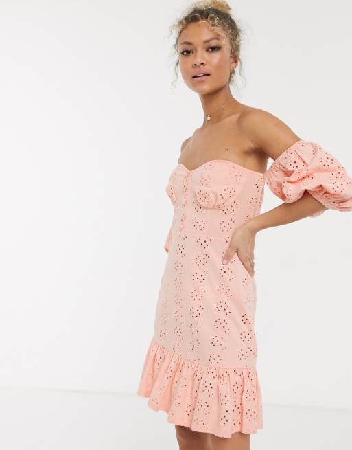 ASOS DESIGN - Prendisole corto in pizzo con coppe preformate, spalle scoperte e fondo a balze rosa