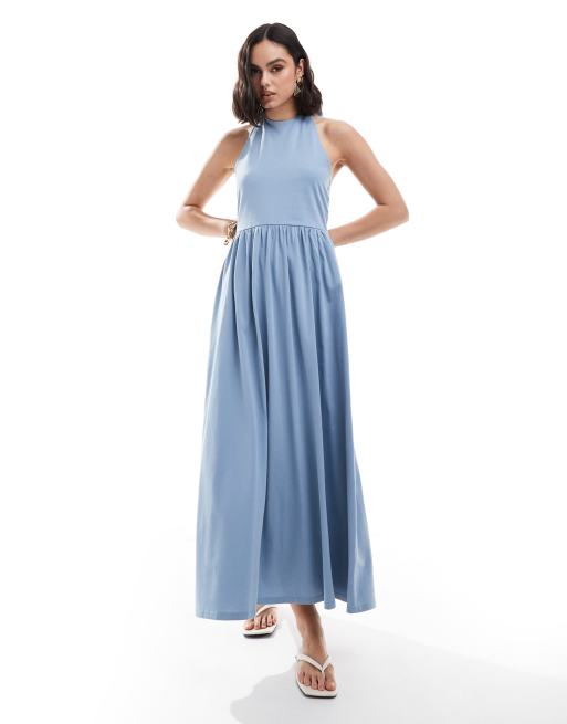 ASOS DESIGN - Prendisole lungo allacciato al collo blu sbiadito scollato sul retro