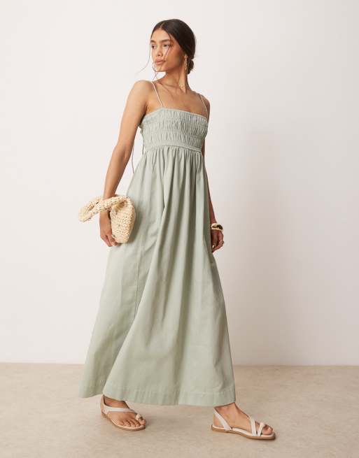 ASOS DESIGN - Prendisole lungo in rasatello di cotone color salvia con bustino arricciato