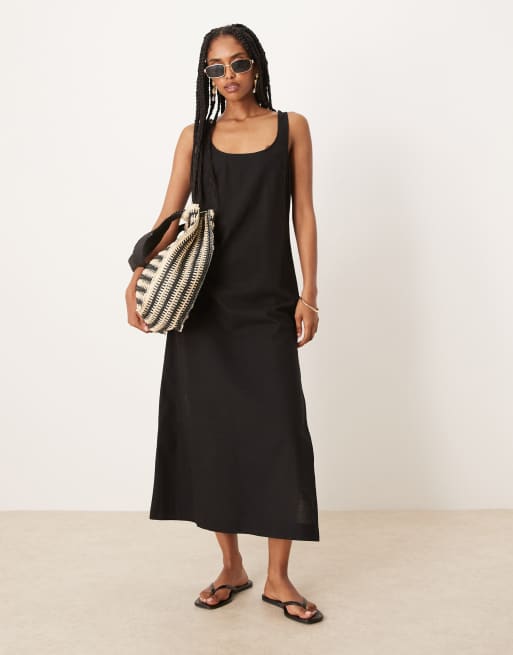 ASOS DESIGN - Prendisole midi in lino e cotone nero con scollo rotondo