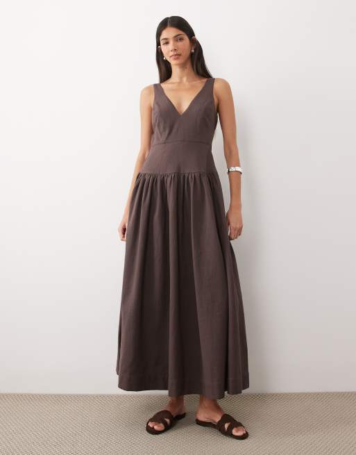 ASOS DESIGN - Prendisole midi marrone con scollo a V profondo e vita scesa