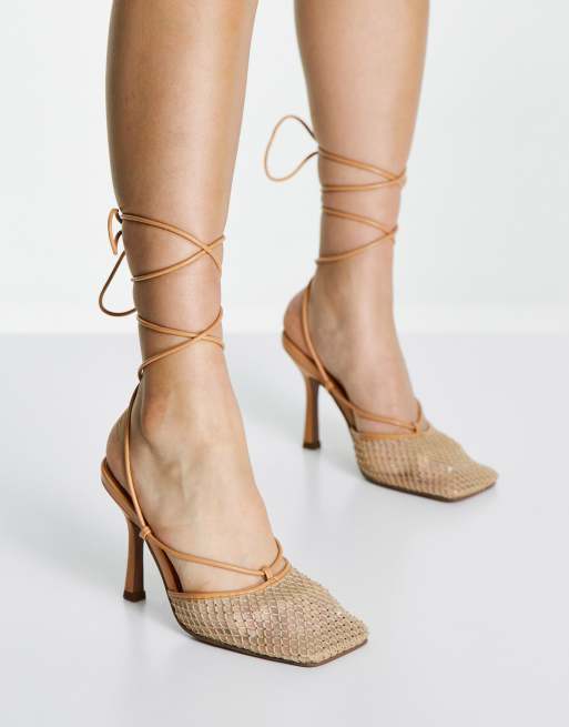 ASOS DESIGN - Princella - Scarpe con tacco beige decorate con punta quadrata e laccio sulla gamba