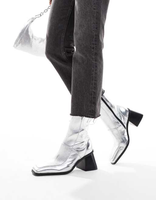 ASOS DESIGN - Ria - Stivali argento in pelle con tacco medio