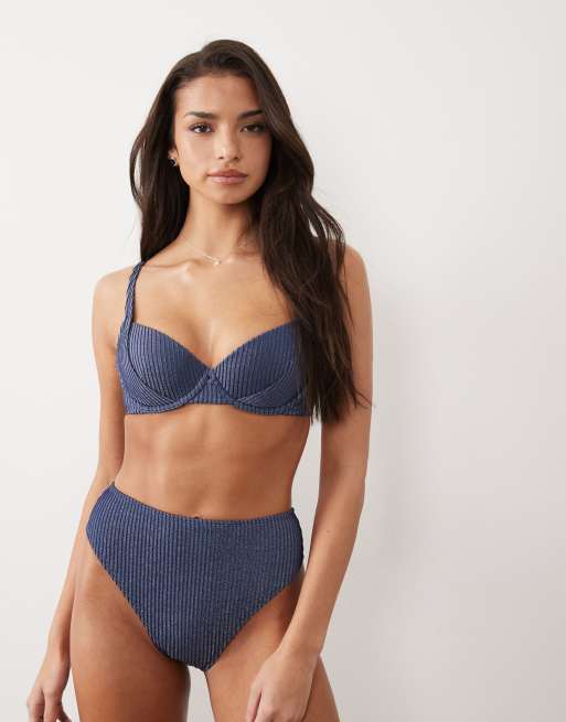 ASOS DESIGN - Riddy Sintra - Top bikini push up imbottito con ferretto blu ardesia a coste glitterato