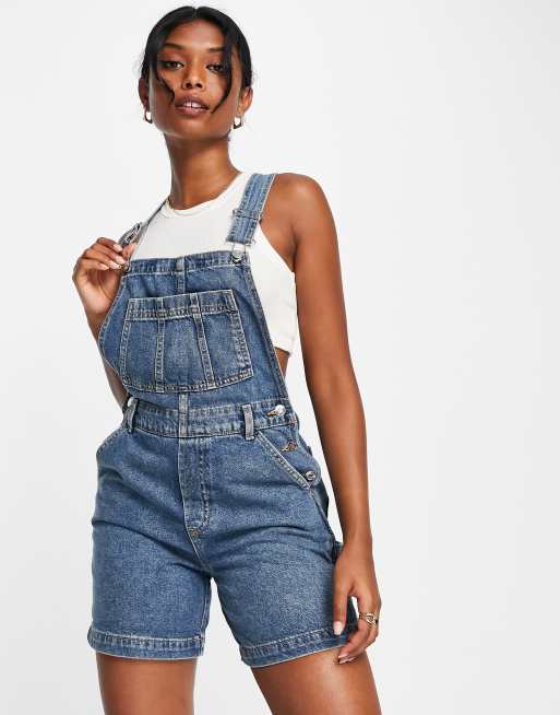 ASOS DESIGN - Salopette corta in denim lavaggio medio