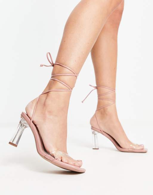 ASOS DESIGN - Sandali con tacco medio allacciati alla gamba trasparenti e beige