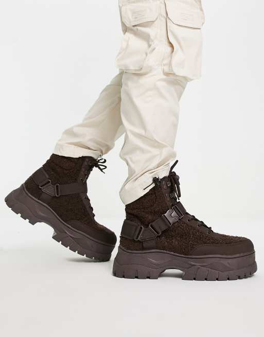 ASOS DESIGN - Scarponcini stringati in pile borg marrone con cinturino e suola spessa