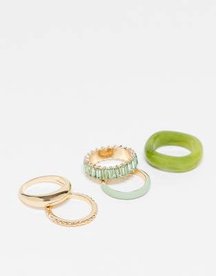ASOS DESIGN - Set da 5 anelli misti in plastica verde e dorati